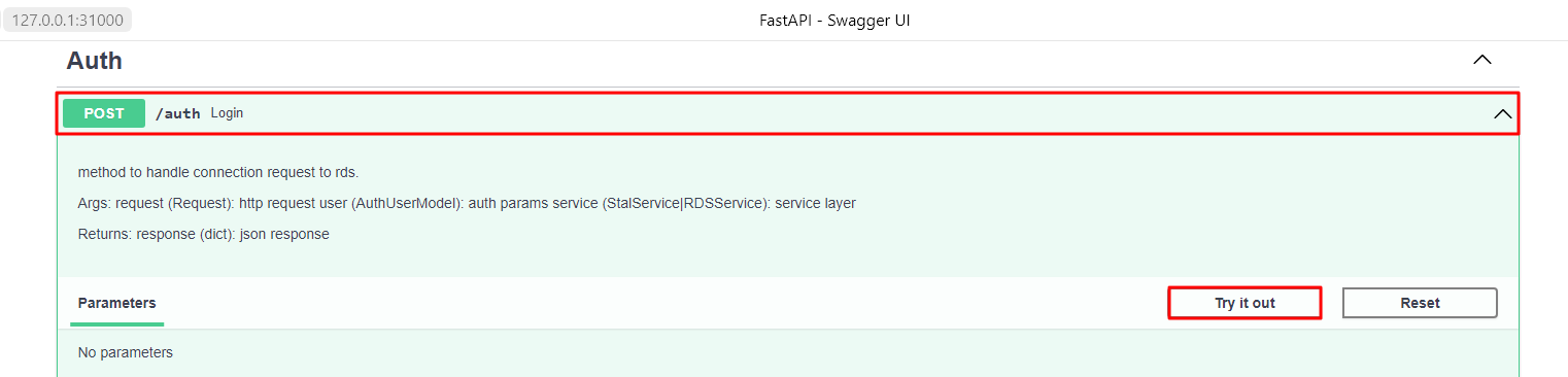 • в разделе «Auth» раскрыть POST-запрос /auth и нажать экранную кнопку [Try it out].