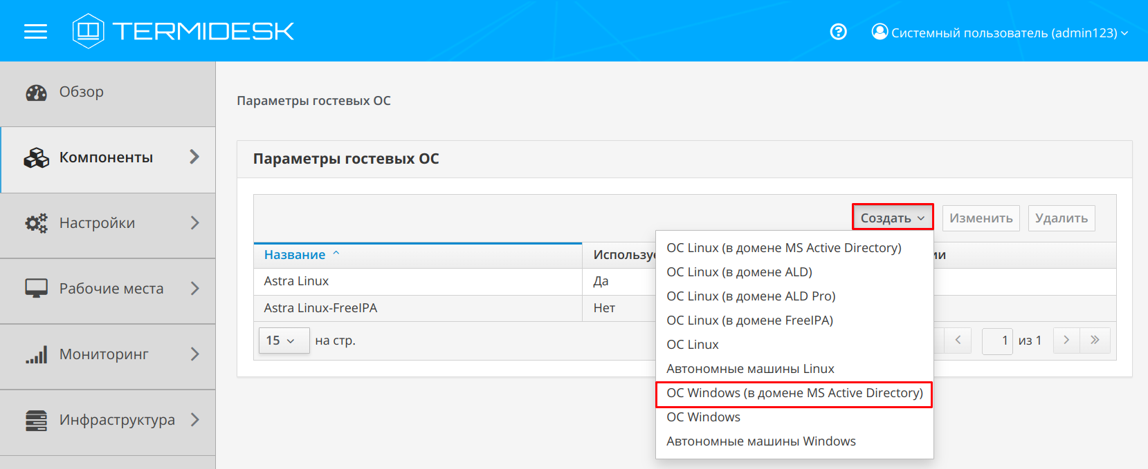 • «Параметры гостевой ОС»: «ОС Windows (в домене MS Active Directory)» — параметры конфигурации гостевой ОС, которые будут использованы при создании РМ;