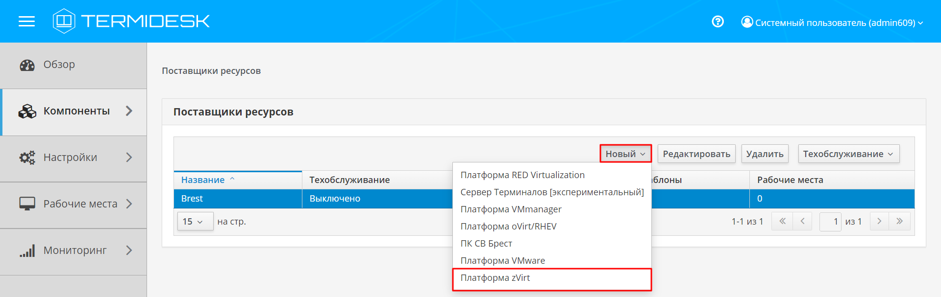 Для добавления поставщика ресурсов в графическом интерфейсе управления Termidesk следует перейти «Компоненты — Поставщики ресурсов», затем нажать экранную кнопку [Новый] и выбрать из выпадающего списка «Платформа zVirt».