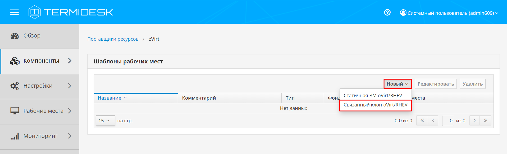 При этом откроется форма «Шаблоны рабочих мест». В открывшейся форме нужно нажать на экранную кнопку [Новый], из выпадающего списка выбрать шаблон: «Связанный клон oVirt/RHEV».