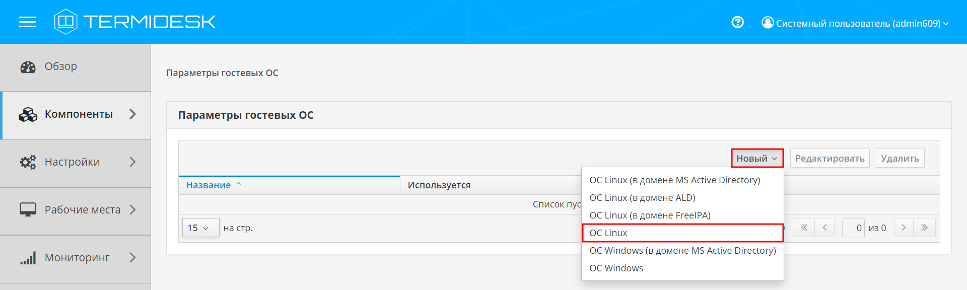 Для добавления параметров конфигурации гостевой ОС следует перейти «Компоненты — Параметры гостевых ОС», затем нажать экранную кнопку [Новый] и выбрать из выпадающего списка тип «ОС Linux».