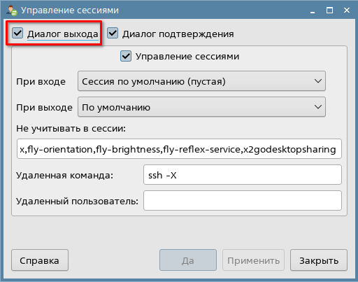 Если требуется, чтобы при завершении работы отображалось окно с выбором действия для завершения работы (см. описание программы «Завершение работы»), необходимо в окне программы установить флаг Диалог выхода.
