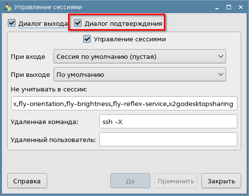 Если требуется, чтобы при завершении работы не отображалось окно с выбором действия для завершения работы (см. Диалог выхода из сессии), а автоматически выполнялось заданное действие, необходимо в окне программы: