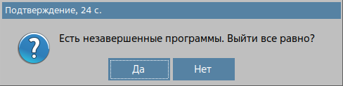 При отображении диалогового окна подтверждения для принудительного закрытия всех незавершенных программ с потерей несохраненных данных и выхода из сессии или выключения следует нажать на кнопку [Да]. Для отмены выхода из сессии или выключения нажать на кнопку [Нет]. При бездействии более 30 секунд все незавершенные программы будут закрыты принудительно с потерей несохраненных данных и будет выполнен выход из сессии или выключение компьютера.