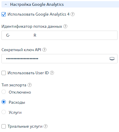 - Секретный ключ API — укажите секретный ключ для Measurement Protocol. Только для Google Analytics 4;