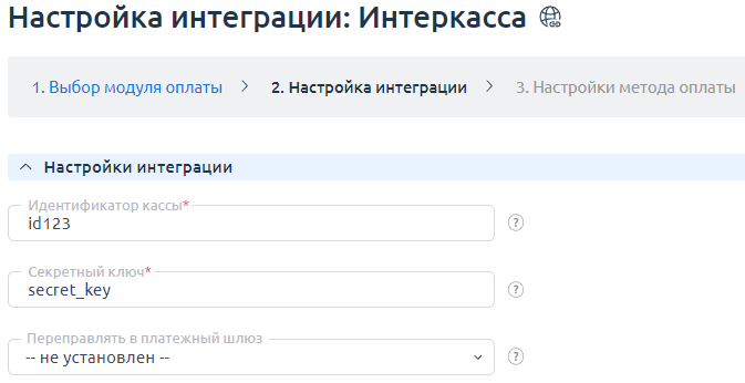 - Секретный ключ — cекретный ключ кассы в системе Интеркасса. Можно найти в настройках кассы в разделе "Безопасность". Для проведения тестовых платежей необходимо указать "Тестовый ключ".