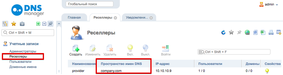 Отличие от серверов имен провайдера: создаваемый в DNSmanager пользователь использует собственное пространство имен, а не пространство имен реселлера. Доменные имена пользователя будут изолированы от других доменов, располагающихся на сервере в других пространствах имен.