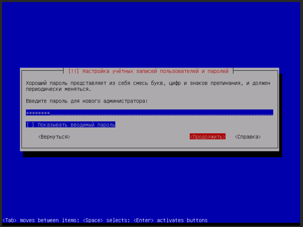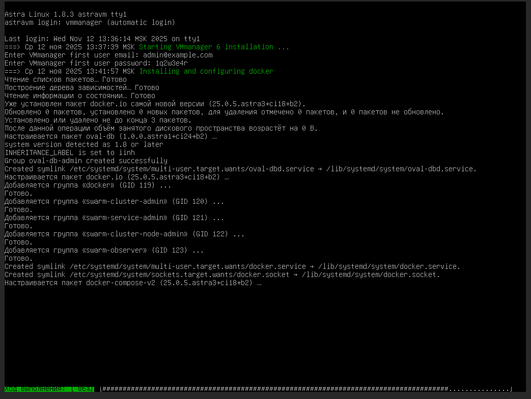 - При появлении запроса Enter VMmanager first user password придумайте и введите пароль администратора платформы. Запустится установка платформы.