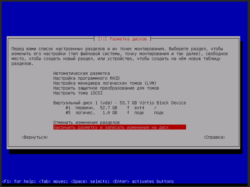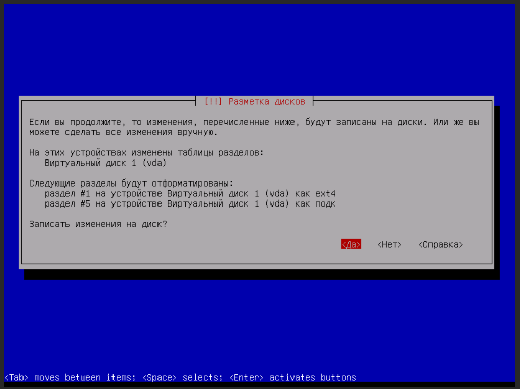 - Выберите ответ Да на вопрос Записать изменения на диск? После этого запустится процесс установки и сервер будет перезагружен.