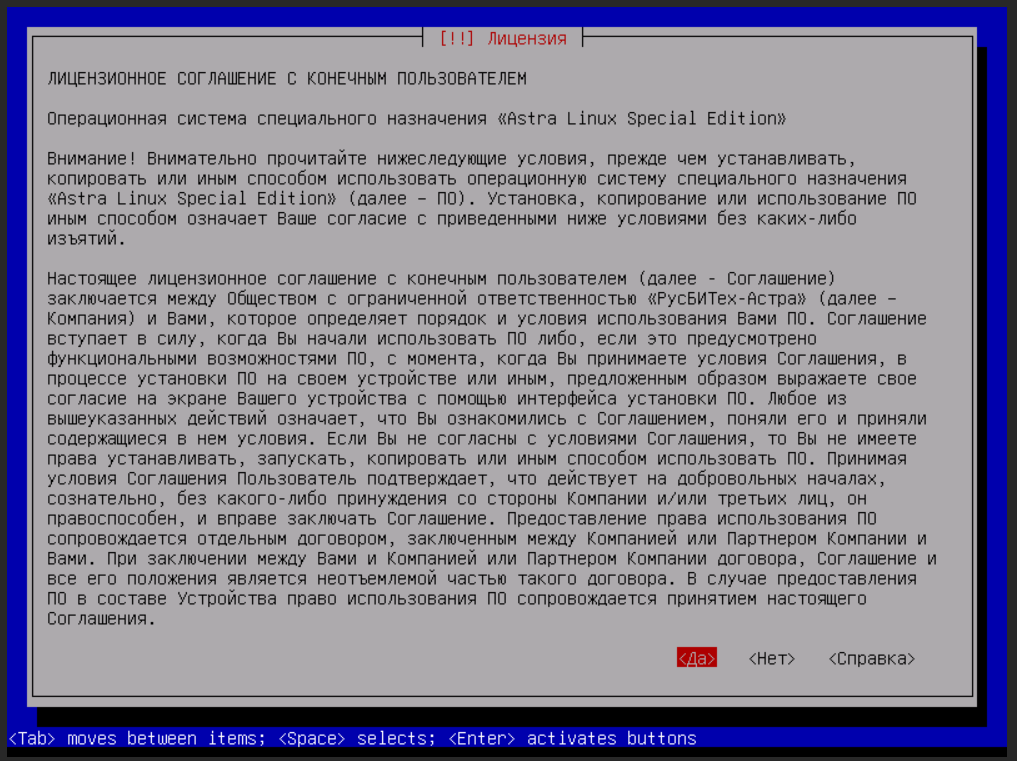- Ознакомьтесь с лицензионным соглашением ОС Astra Linux и выберите ответ Да.