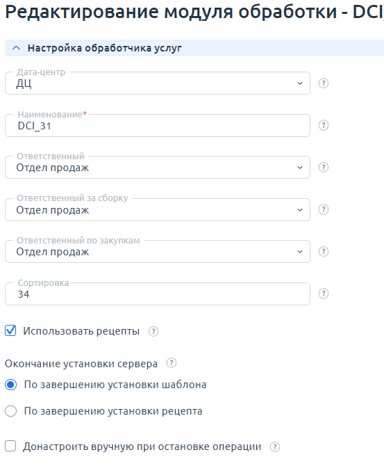 Использовать рецепты — если флаг активен, то при заказе услуги клиент сможет выбрать подходящий рецепт — на странице заказа услуги появится поле "Предустановленное ПО".