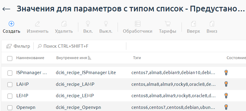 Для каждого значения указываются тэги. Они позволяют настроить взаимосвязь между параметрами "Предустановленное ПО" и "Операционная система", а также с ресурсом "Лицензия на панель управления".