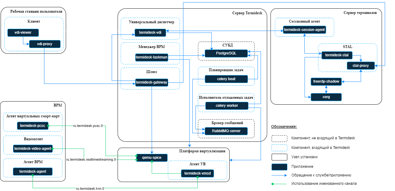 Схема взаимодействия компонентов Termidesk и приложений представлена на