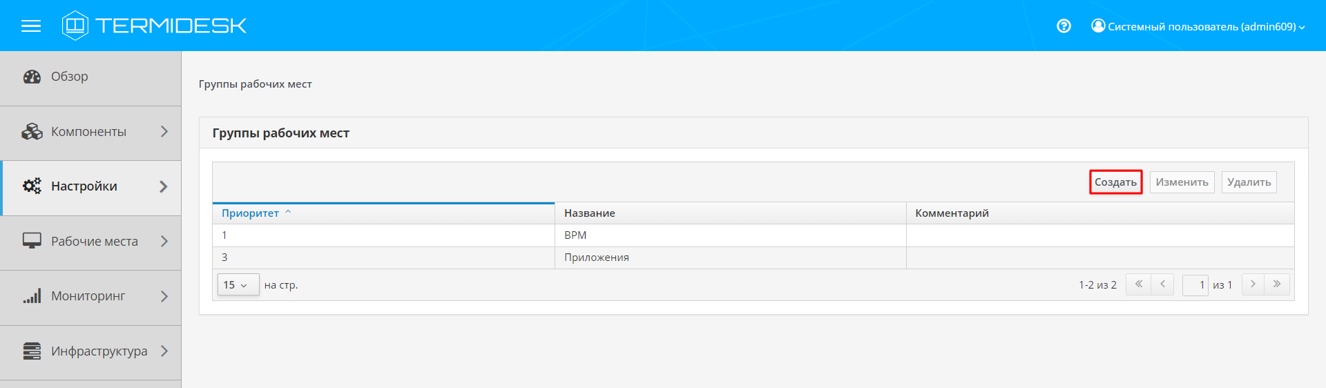 Для добавления группы рабочих мест следует перейти «Настройки — Группы рабочих мест» и нажать экранную кнопку [Создать].