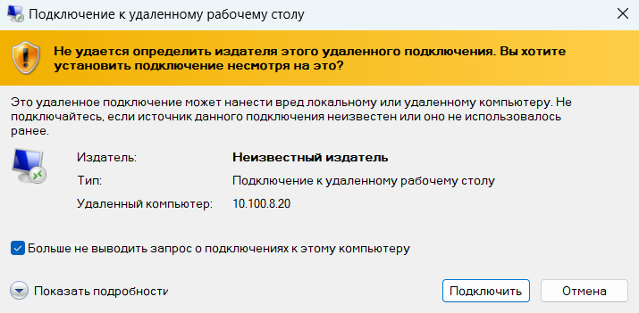 Для подключения к ВРМ без подтверждения рекомендуется включить параметр «Больше не выводить запрос о подключениях к этому компьютеру».