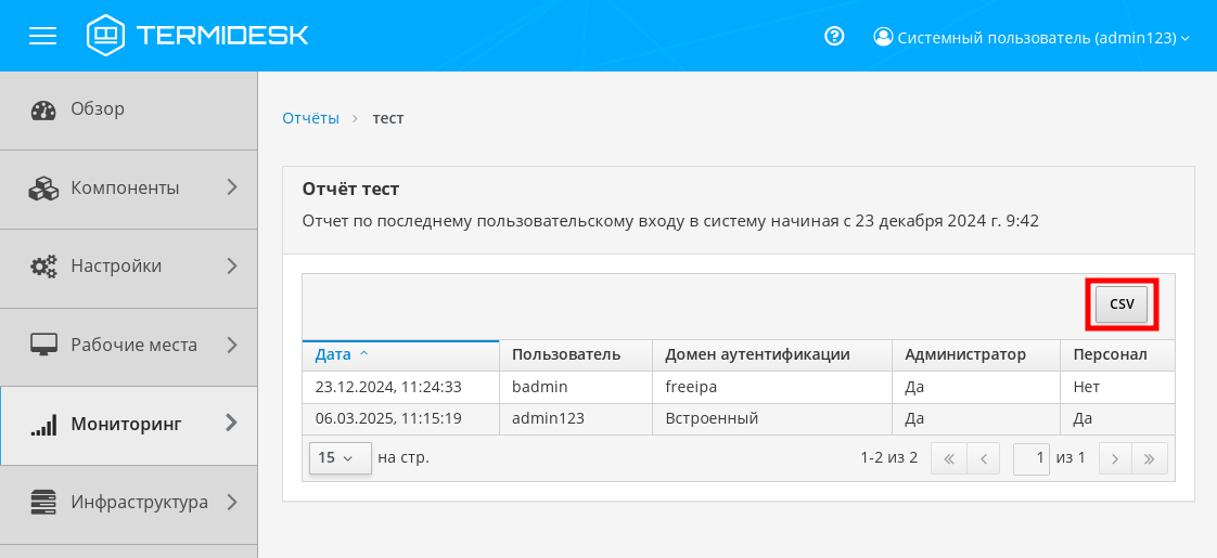 Параметры для формирования отчета по последнему пользовательскому входу в Termidesk