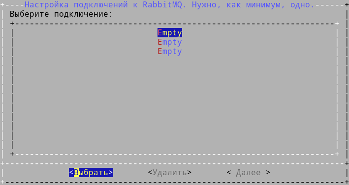 - настроить подключение к RabbitMQ. Для этого выбрать в следующем окне пункт «Empty» и нажать экранную кнопку [Выбрать]. Необходимо задать хотя бы одно подключение к RabbitMQ, если не будет задано ни одно подключение, то при нажатии на кнопку [Далее] произойдет возврат в диалог настройки подключений;