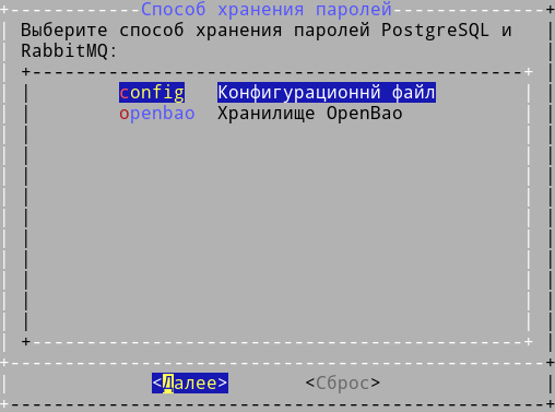 /etc/opt/termidesk-vdi/termidesk.conf; - «openbao» - для хранения паролей будет использоваться хранилище паролей OpenBao (хранилище должно быть заранее создано и настроено);