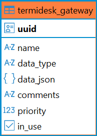 Справочный центр Termidesk Администратору База данных Termidesk Структура базы данных Таблицы Current: Таблица: termidesk_gateway PDF Download PDF Download page Таблица: termidesk_gateway. Current page All pages Таблица: termidesk_gateway Таблица добавлена в Termidesk версии 6.0. Назначение таблицы: содержит информацию о профилях «Шлюза». Перечень полей таблицы termidesk_gatewayПолеОписаниеuuidУникальный идентификатор профиля «Шлюза»nameНаименование профиля «Шлюза» data_typeТип объектаdata_jsonДанные в формате jsoncommentsКомментарий к профилю «Шлюза»priorityПриоритет использования профиля «Шлюза»in_useСтатус использования профиля «Шлюза» Значения, которые может принимать параметр «data_type»ОбъектОписаниеTermideskGatewayПрофиль «Шлюза» Диаграмма таблицы termidesk_gateway ×