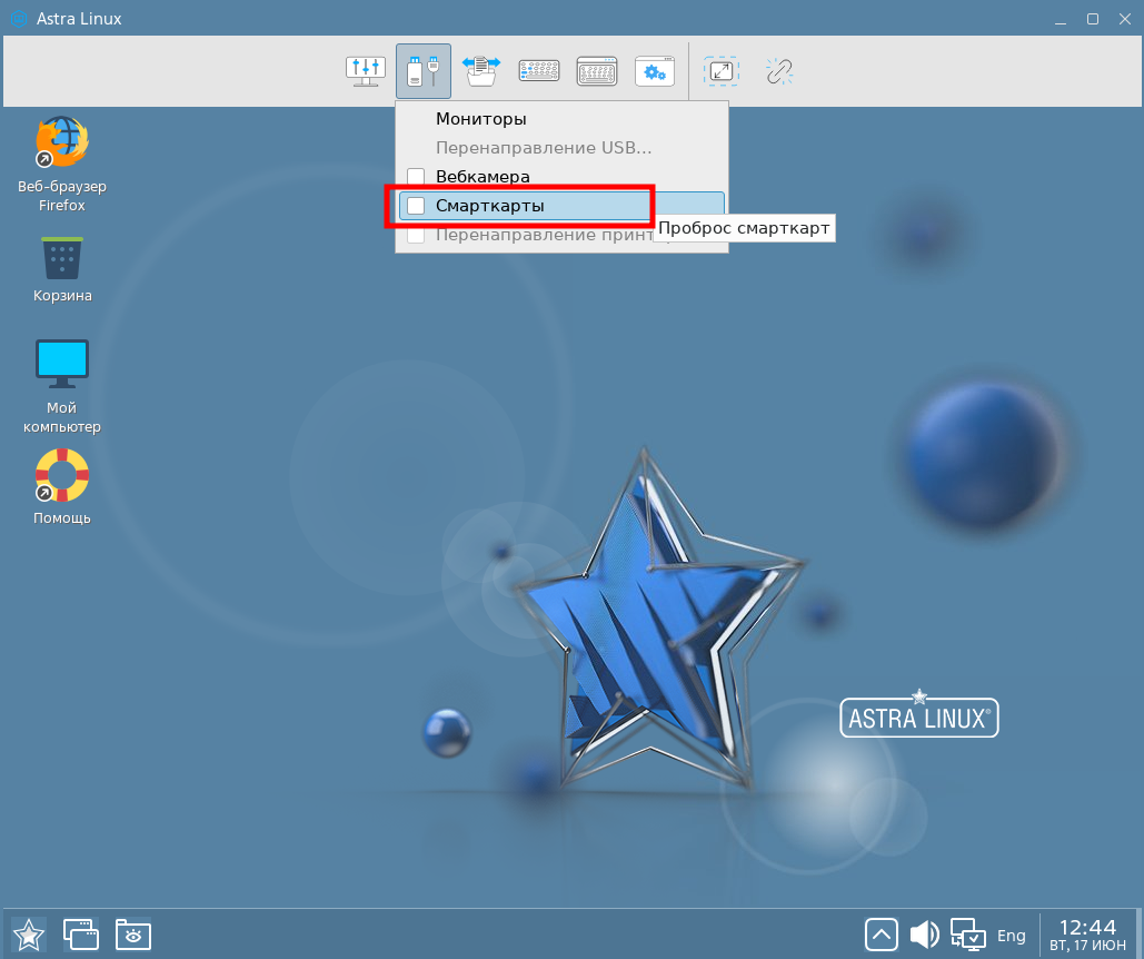 stal-service.jsonпараметруredirect:smartcardзадано значениеtrue; - установлен набор ПО для ключевого носителя, как приведено в подразделе Настройки гостевой ОС.