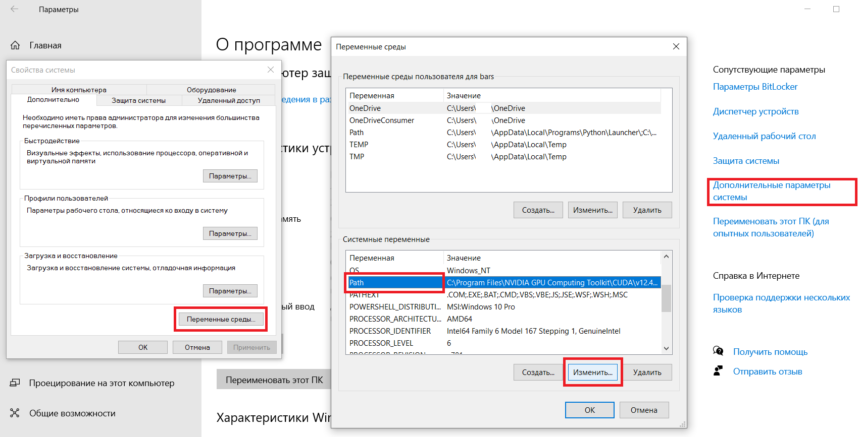 модифицировать системную переменную окружения PATH, добавив значениеC:\msys64\mingw64\bin. Для этого перейти в «Пуск», найти «Этот компьютер» и нажать на этот пункт правой кнопкой мыши, выбрать «Свойства». В открывшемся окне перейти в «Дополнительные параметры системы» и во вкладке «Дополнительно» нажать экранную кнопку [Переменные среды]. Выбрать переменную «Path» в списке системных переменных, нажать экранную кнопку [Изменить], добавить значение C:\msys64\mingw64\bin;