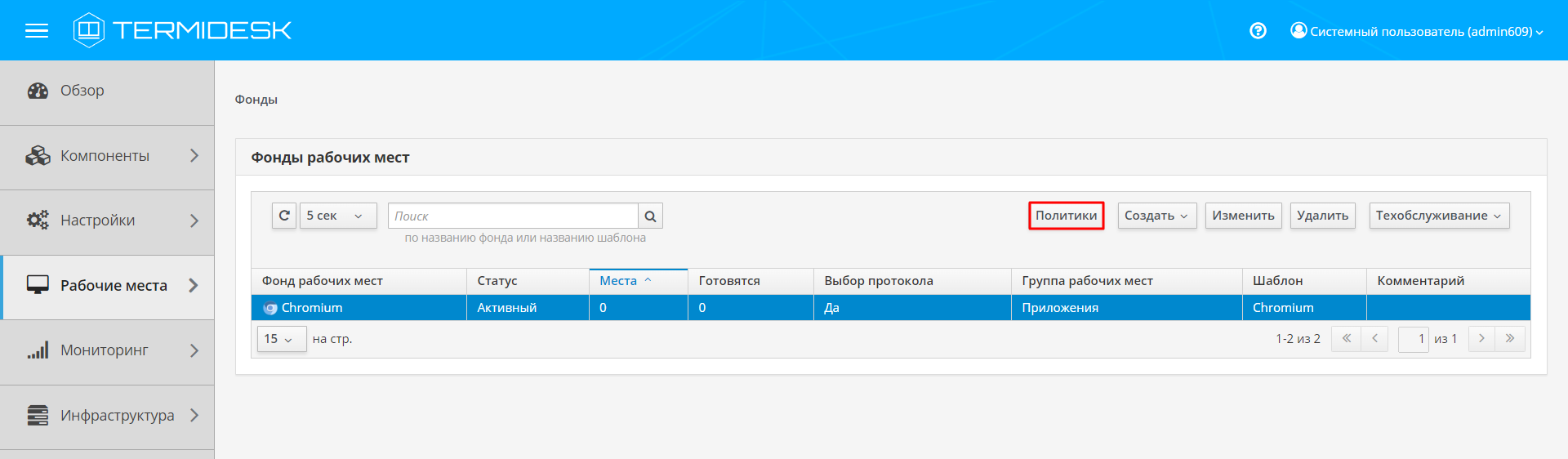 Для настройки аутентификации на уровне сети следует перейти «Рабочие места — Фонды», в сводной таблице в столбце «Фонд рабочих мест» выделить фонд с опубликованным приложением и нажать экранную кнопку [Политики].