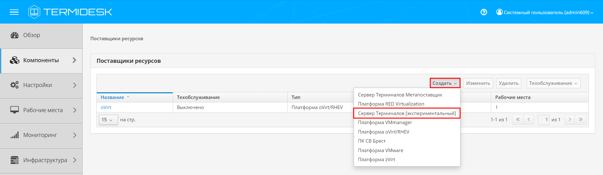 Для добавления поставщика ресурсов STAL следует перейти «Компоненты — Поставщики ресурсов», нажать экранную кнопку [Создать] и выбрать из выпадающего списка «Сервер Терминалов [экспериментальный]».