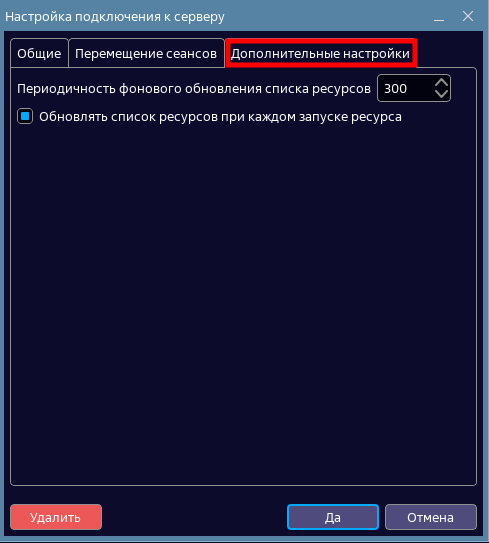 Для настройки параметров обновления списка ресурсов нужно нажать на графический элемент в виде шестеренки в правом верхнем углу для выбранного сервера. В открывшемся окне «Настройка подключения к серверу» на вкладке «Дополнительные настройки» будут доступны следующие параметры управления: