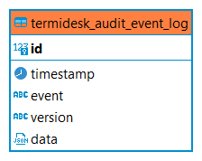 Справочный центр Termidesk Администратору База данных Termidesk Структура базы данных Таблицы Current: Таблица: termidesk_audit_event_log PDF Download PDF Download page Таблица: termidesk_audit_event_log. Current page All pages Таблица: termidesk_audit_event_log Назначение таблицы: содержит информацию о событиях, произошедших в системе аудита. Перечень полей таблицы termidesk_audit_event_logПолеОписаниеidИдентификаторtimestampДата и время события с указанием часового пояса (формат UTC)eventНаименование событияversionВерсия событияdataДанные события (json-строка) Подробное описание типов событий аудита, регистрируемых в поле «event» приведено в справочном центре Termidesk:для «Универсального диспетчера»: https://wiki.astralinux.ru/termidesk-help/latest/dokumentatsiya/termidesk-nastrojka-programmnogo-kompleksa/sistema-audita/opisanie-shablonov-sobytij-audita/tipy-i-shablony-registriruemyh-sobytij-audita;для «Агрегатора»: https://wiki.astralinux.ru/termidesk-help/latest/dokumentatsiya/termidesk-agregator/agregator-sistema-audita/agregator-opisanie-shablonov-sobytij-audita/agregator-tipy-i-shablony-registriruemyh-sobytij-audita.Диаграмма таблицы приведена на рисунке.Диаграмма таблицы termidesk_audit_event_log ×