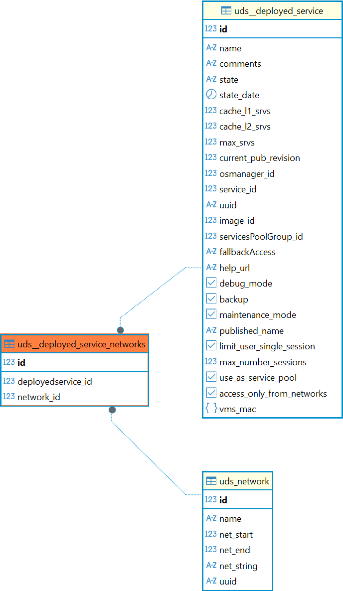 Справочный центр Termidesk Администратору База данных Termidesk Структура базы данных Таблицы Current: Таблица: uds__deployed_service_networks PDF Download PDF Download page Таблица: uds__deployed_service_networks. Current page All pages Таблица: uds__deployed_service_networks Таблица добавлена в Termidesk версии 6.0. Назначение таблицы: содержит информацию о сетях, связанных с фондами виртуальных рабочих мест. Перечень полей таблицы uds__deployed_service_networksПолеОписаниеidИдентификаторdeployedservice_idИдентификатор фондаnetwork_idИдентификатор сети Диаграмма таблицы uds__deployed_service_networks ×