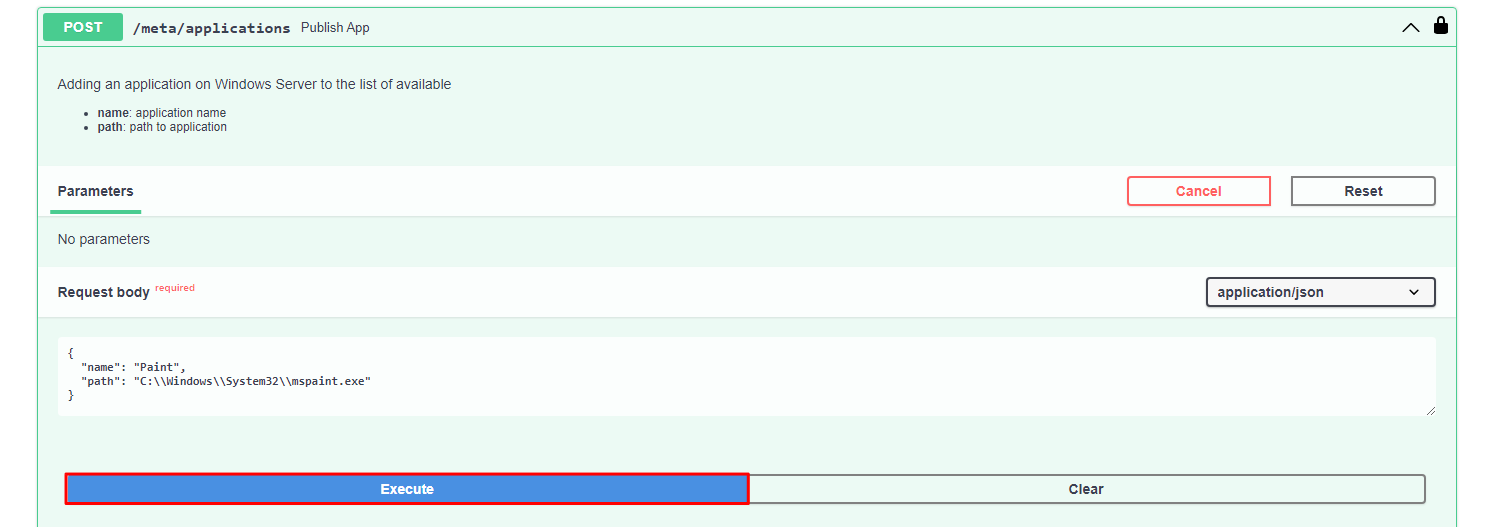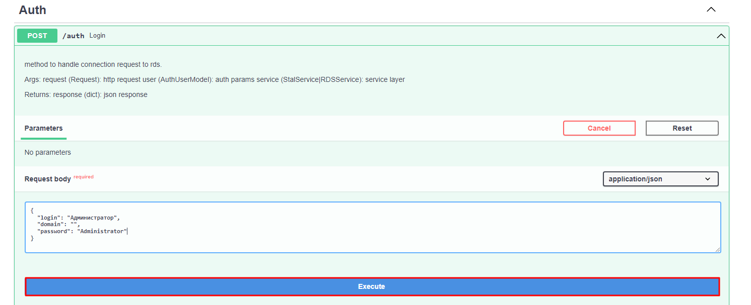При этом поле «Request body» станет доступно для редактирования. После заполнения параметров авторизации нажать экранную кнопку [Execute] для выполнения POST-запроса.