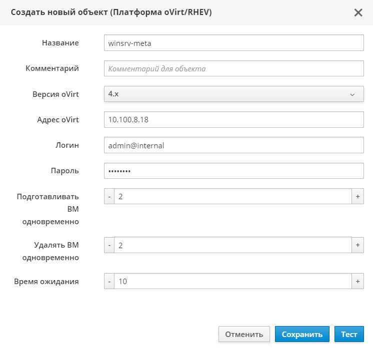 При этом откроется окно «Создать новый объект (Платформа oVirt/RHEV)».