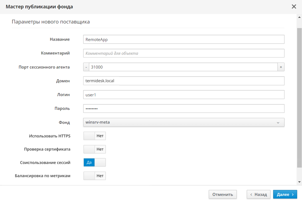- «Имя публикации»: «метапоставщик MS RDSH» — название публикации;