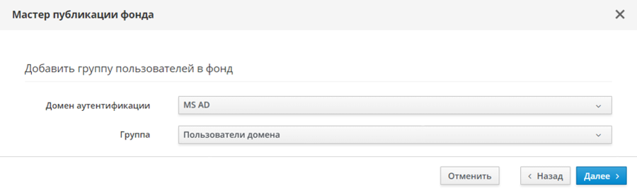 Затем выбрать пользователя домена аутентификации. Шаг опционален: параметры можно добавить после завершения работы мастера публикации, в созданном фонде на странице «Рабочие места - Фонды».