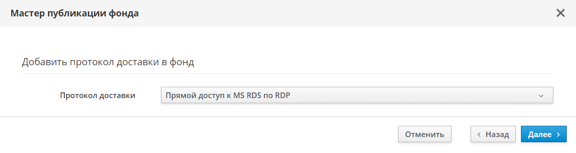 - «Протоколы доставки»: «Прямой доступ к MS RDS по RDP» — выбор одного или нескольких протоколов доставки, которые будут доступны для фонда РМ;