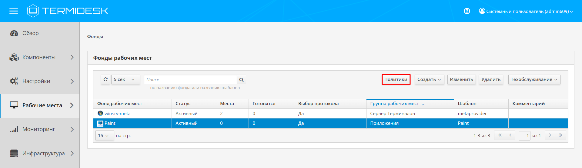 Для настройки обеспечения безопасности на уровне сети следует перейти «Рабочие места — Фонды», в сводной таблице в столбце «Фонд рабочих мест» выделить фонд с опубликованным приложением и нажать экранную кнопку [Политики].