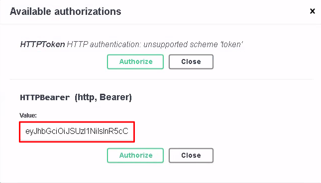 В открывшемся окне «Available authorizations» следует вставить значение токена в поле «Value» и нажать экранную кнопку [Authorize].