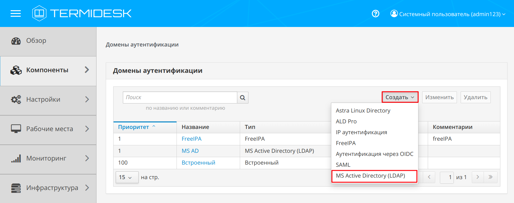 - «Аутентификация»: «MS AD» — выбор домена аутентификации, настроенного в шаге 4;