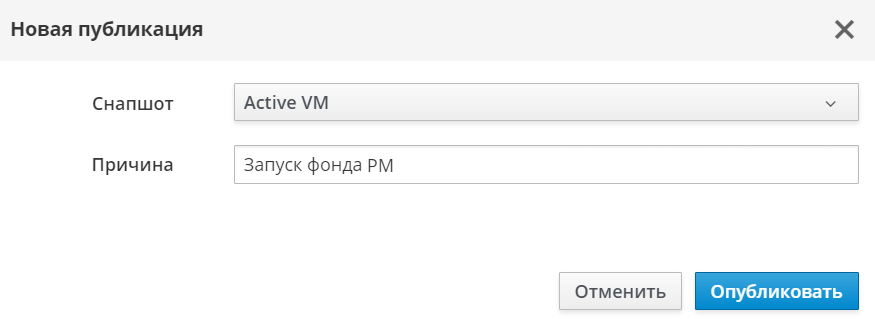 В окне «Новая публикация» в раскрывающемся списке выбрать ВМ, на основе которой будет выполняться тиражирование РМ. После ввода опционального текстового комментария нажать экранную кнопку [Опубликовать] для запуска задачи создания фонда РМ.