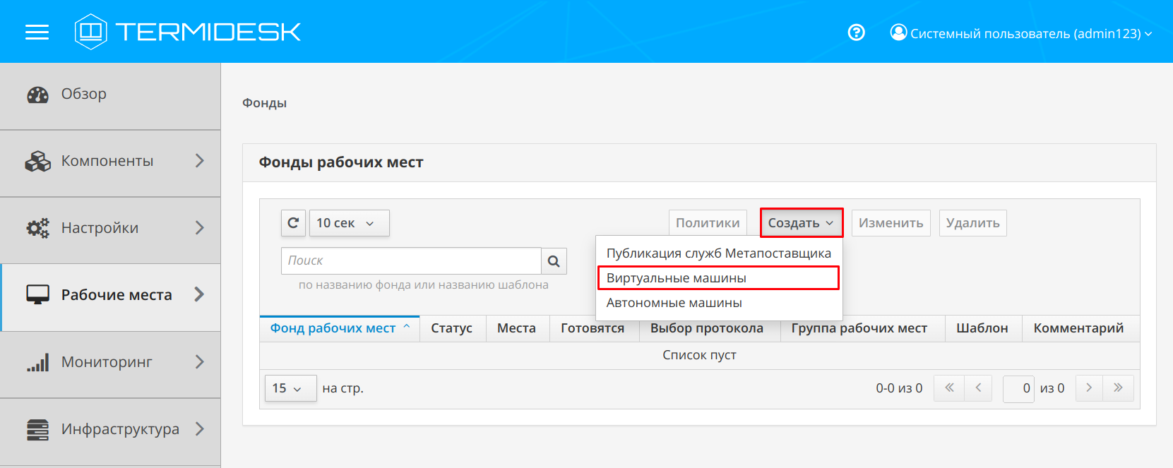 Для добавления нового фонда РМ следует перейти «Рабочие места — Фонды», нажать экранную кнопку [Создать] и из выпадающего списка выбрать тип мастера публикации: «Виртуальные машины».