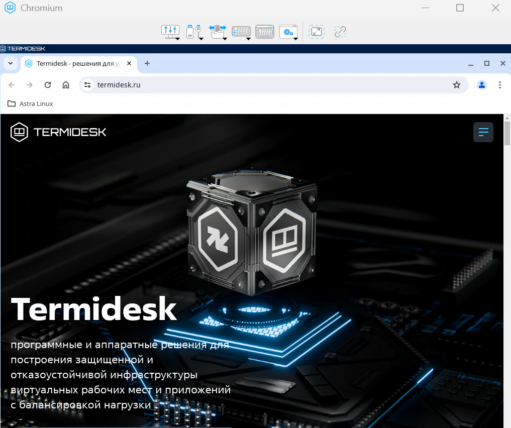 - окно ПО Termidesk Viewer с опубликованным приложением, если параметр «Соединение по RDP через Termidesk Viewer (экспериментально)» активирован: