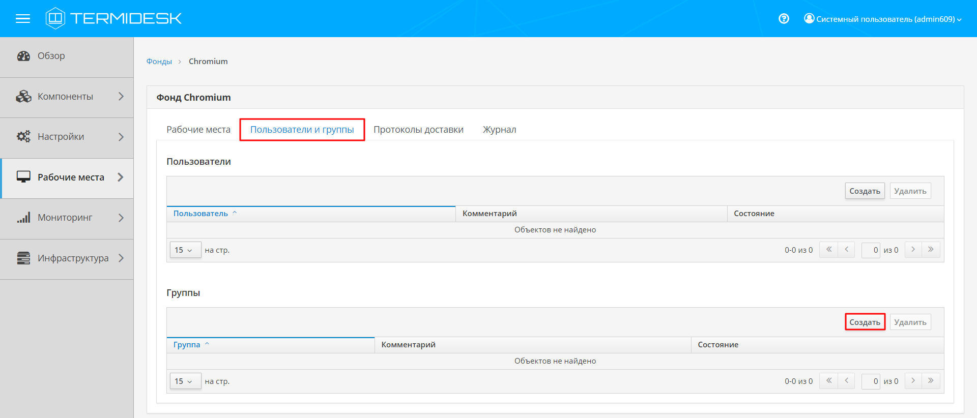 На открывшейся странице во вкладке «Пользователи и группы» нажать экранную кнопку [Создать].