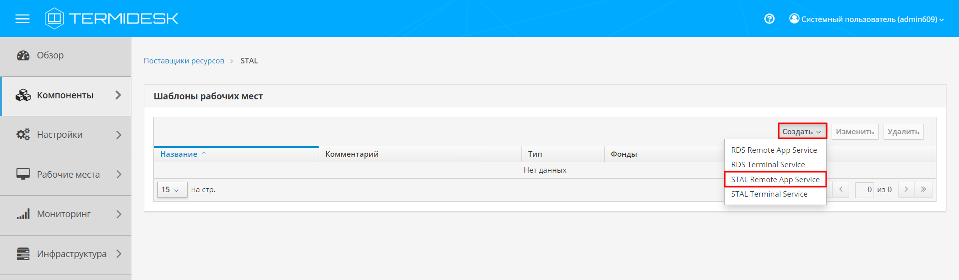 Для добавления шаблона следует перейти «Компоненты — Поставщики ресурсов», в столбце «Название» сводной таблицы нажать на наименование поставщика ресурсов STAL.