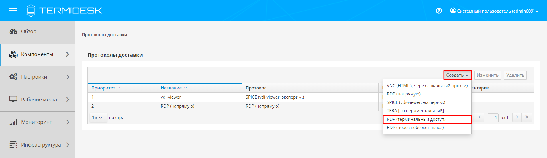 Для добавления протокола доставки следует перейти «Компоненты — Протоколы доставки», нажать экранную кнопку [Создать] и выбрать из выпадающего списка соответствующий протокол.