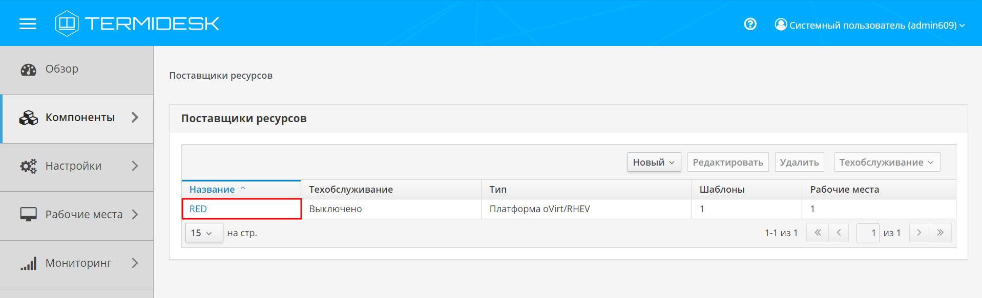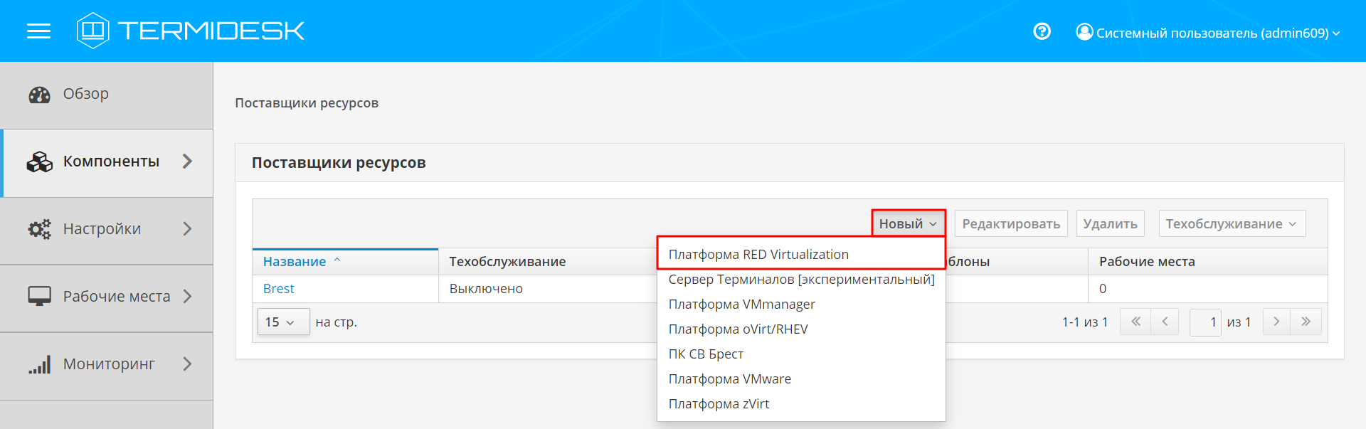Для добавления поставщика ресурсов в графическом интерфейсе управления Termidesk следует перейти «Компоненты — Поставщики ресурсов», затем нажать экранную кнопку [Новый] и выбрать из выпадающего списка «Платформа RED Virtualization».