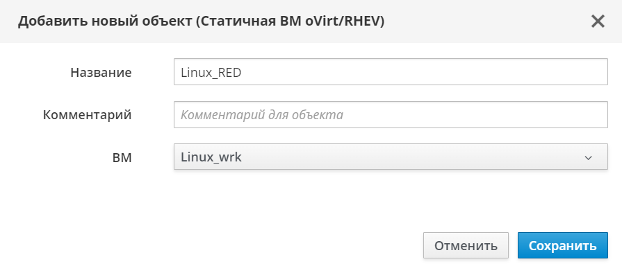 При этом откроется окно «Добавить новый объект (Статичная ВМ oVirt/RHEV)». В окне нужно заполнить поля «Название», «Комментарий» (при необходимости).