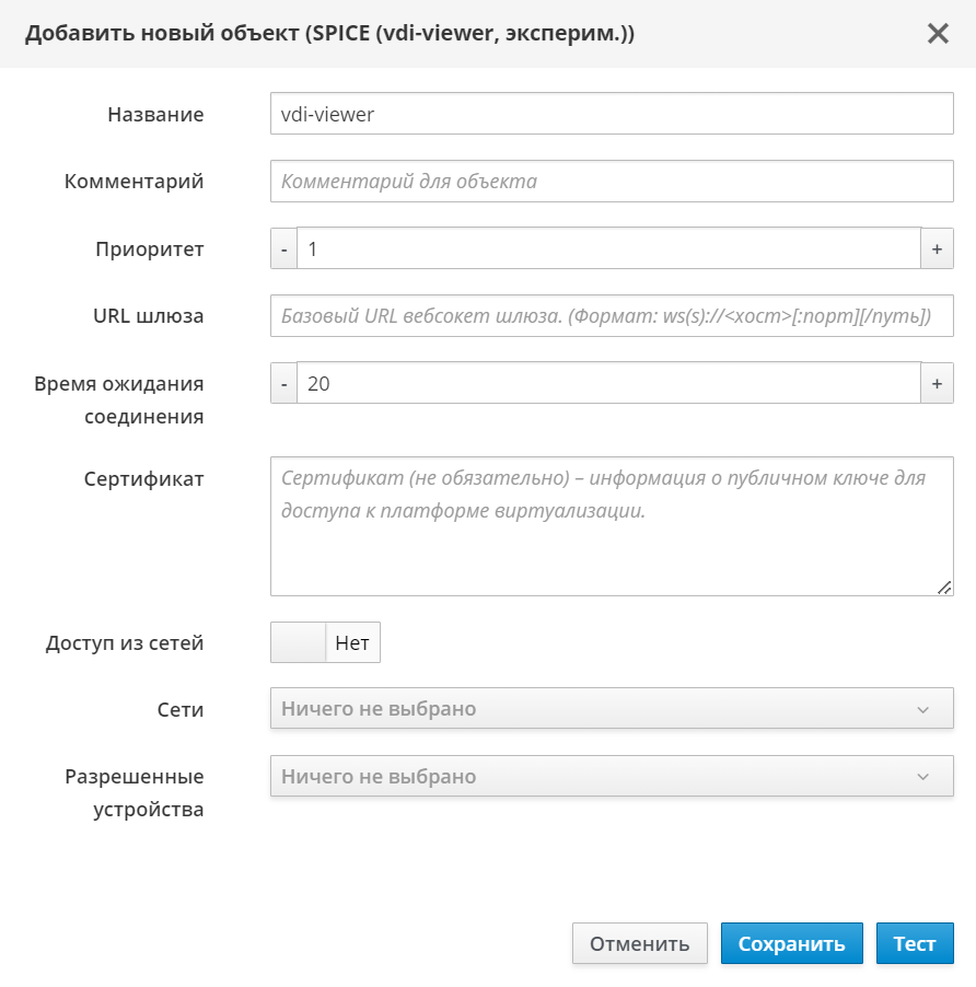 При этом откроется окно «Добавить новый объект (SPICE (vdi-viewer, эксперим.))».