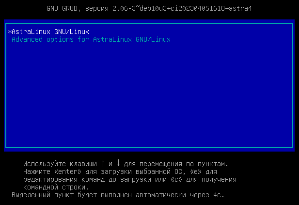 • выбрать в меню GRUB пункт «AstraLinux GNU/Linux» (по умолчанию) и нажать клавишу <Enter>;