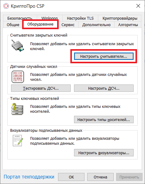 - перейти во вкладку «Оборудование» и нажать экранную кнопку [Настроить считыватели];