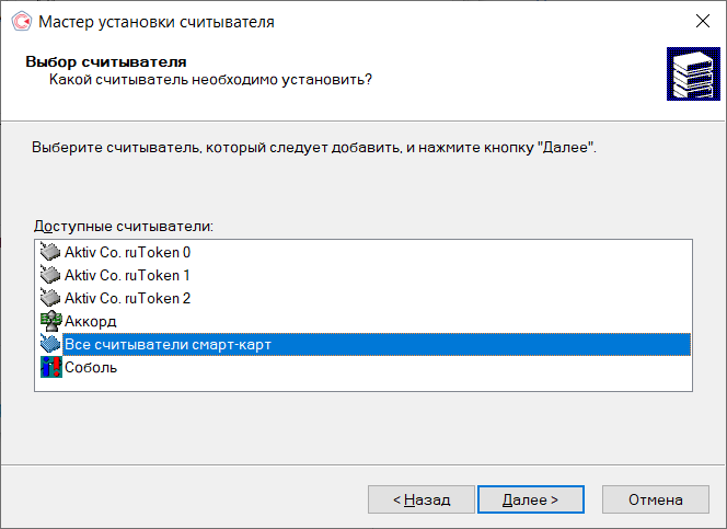- в открывшемся окне нажать экранную кнопку [Добавить...] и выбрать в мастере установки выбрать пункт «Все считыватели смарт-карт». Затем нажать экранные кнопки [Далее] и [Готово] для завершения работы с мастером;